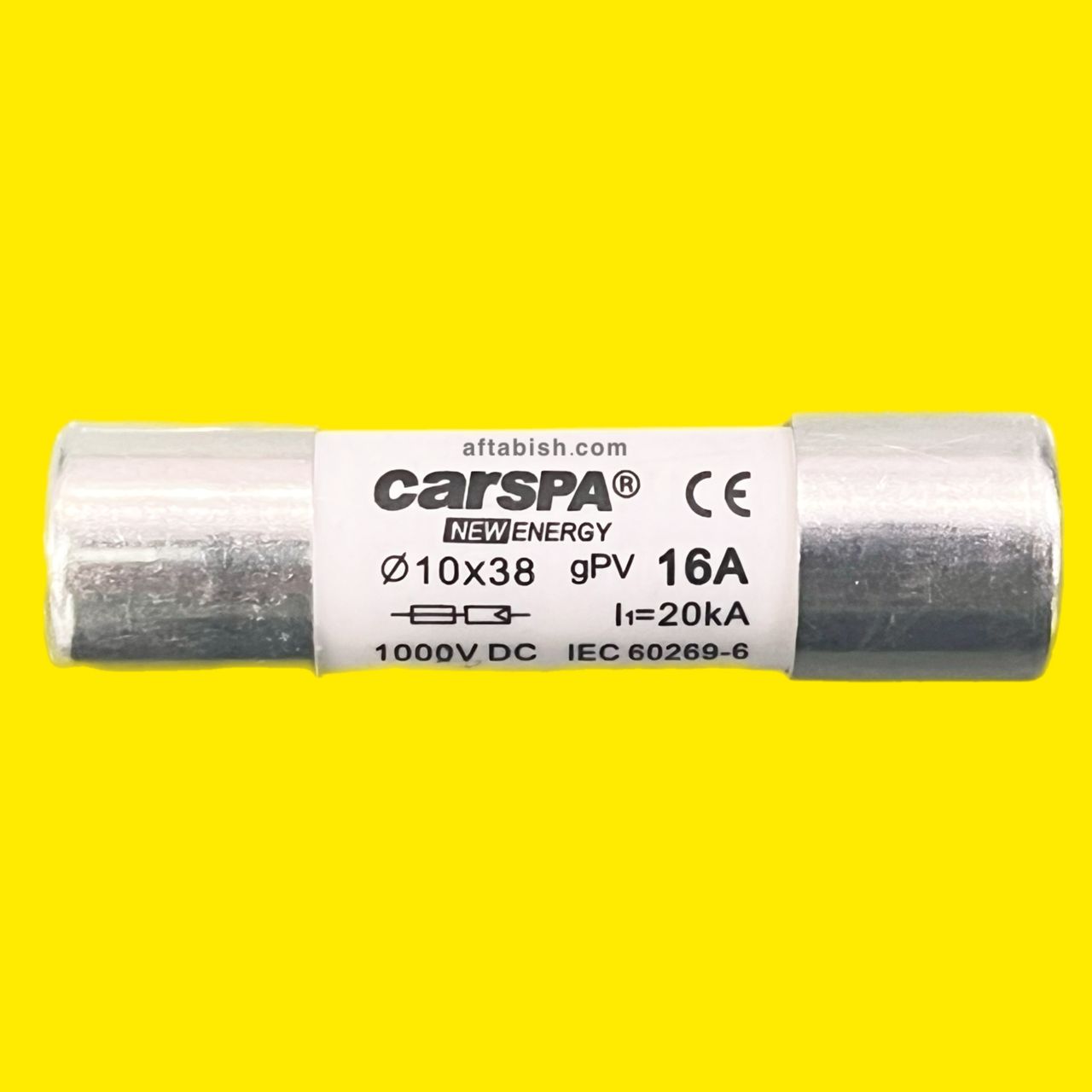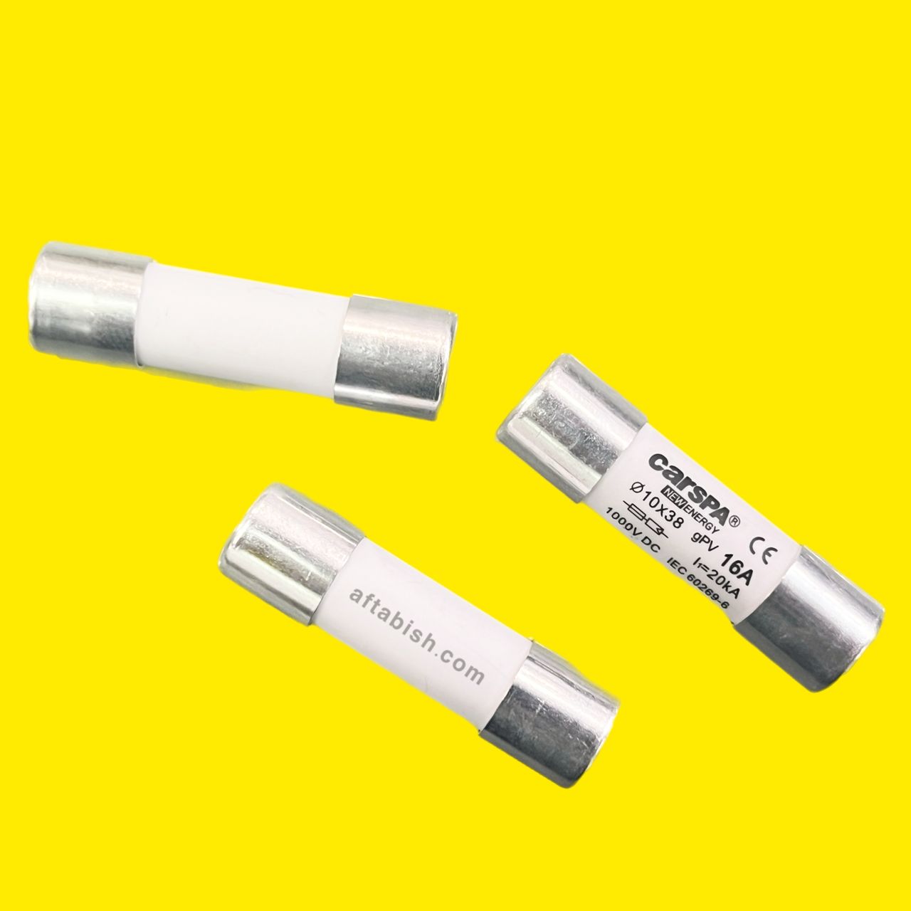 فیوز DC سیلندری ۱۶ آمپر برای حفاظت هر استرینگ پنل خورشیدی طراحی شده است. اندازهٔ ۱۰×۳۸ میلیمتر